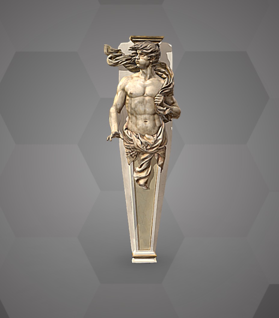 3D scan of a figure of a young man blowing air out of his mouth, that is part of the architecture in Hall 6 of the NHM Vienna, representing the element of “Air”. Wind also appears to blow through his hair and billows his robe.